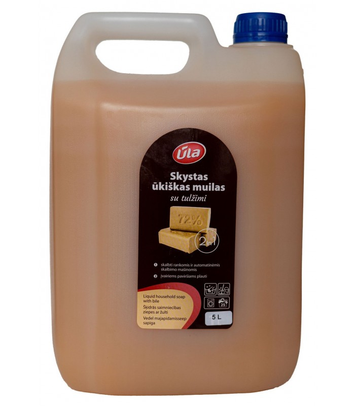 SKYSTAS ŪKIŠKAS MUILAS ŪLA SU TULŽIMI 5 L PASKIRTIS: Universali skalbimo ir valymo priemonė su ūkišku muilu ir fermentais, praturtinta natūralia tulžimi. Tinka skalbti rankomis ir automatinėmis skalbimo mašinomis. Sudėtyje esantys fermentai ir tulžis efektyviai šalina nemalonius kvapus, maisto, purvo dėmes ir kitus nešvarumus. Skalbdami vadovaukitės gamintojo rekomendacijomis. Galima valyti įvairius paviršius: duris, grindis, kriaukles ir kitus vandeniui atsparius paviršius. Valymui naudoti tirpalą: 20 ml priemonės 5 L šilto vandens. SUDĖTIS: < 5 % anijoninių aktyviųjų paviršiaus medžiagų, < 5 % nejoninių aktyviųjų paviršiaus medžiagų, < 5 % amfoterinių aktyviųjų paviršiaus medžiagų, < 5 % muilo, fermentai, konservantas, Benzisothiazolinone, Methylisothiazolinone, Laurylamine Dipropylenediamine, kvapioji medžiaga, dažikliai. SAUGA: Atsargiai. Sukelia smarkų akių dirginimą. Laikyti vaikams neprieinamoje vietoje. Mūvėti apsaugines pirštines / naudoti akių (veido) apsaugos priemones. PATEKUS Į AKIS: Kelias minutes atsargiai plauti vandeniu. Išimti kontaktinius lęšius, jeigu jie yra ir jeigu lengvai galima tai padaryti. Toliau plauti akis. Jei akių dirginimas nepraeina: kreiptis į gydytoją. LAIKYMAS: Vėsiose, sausose patalpose. Tinkamumo naudoti terminas nurodytas ant pakuotės.