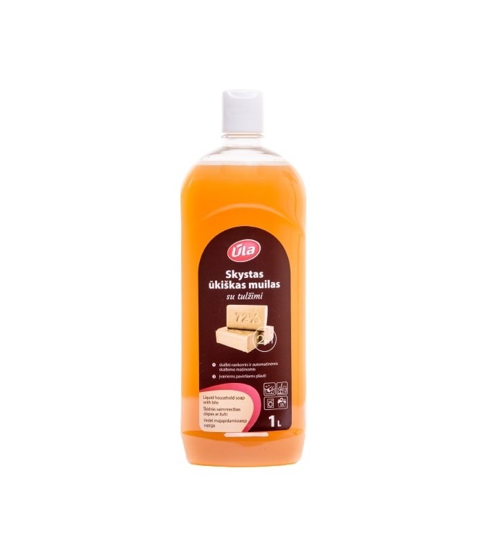 SKYSTAS ŪKIŠKAS MUILAS ŪLA SU TULŽIMI 1 L PASKIRTIS: Universali skalbimo ir valymo priemonė su ūkišku muilu ir fermentais, praturtinta natūralia tulžimi. Tinka skalbti rankomis ir automatinėmis skalbimo mašinomis. Sudėtyje esantys fermentai ir tulžis efektyviai šalina nemalonius kvapus, maisto, purvo dėmes ir kitus nešvarumus. Skalbdami vadovaukitės gamintojo rekomendacijomis. Galima valyti įvairius paviršius: duris, grindis, kriaukles ir kitus vandeniui atsparius paviršius. Valymui naudoti tirpalą: 20 ml priemonės 5 L šilto vandens. SUDĖTIS: < 5 % anijoninių aktyviųjų paviršiaus medžiagų, < 5 % nejoninių aktyviųjų paviršiaus medžiagų, < 5 % amfoterinių aktyviųjų paviršiaus medžiagų, < 5 % muilo, fermentai, konservantas, Benzisothiazolinone, Methylisothiazolinone, Laurylamine Dipropylenediamine, kvapioji medžiaga, dažikliai. SAUGA: Atsargiai. Sukelia smarkų akių dirginimą. Laikyti vaikams neprieinamoje vietoje. Mūvėti apsaugines pirštines / naudoti akių (veido) apsaugos priemones. PATEKUS Į AKIS: Kelias minutes atsargiai plauti vandeniu. Išimti kontaktinius lęšius, jeigu jie yra ir jeigu lengvai galima tai padaryti. Toliau plauti akis. Jei akių dirginimas nepraeina: kreiptis į gydytoją. LAIKYMAS: Vėsiose, sausose patalpose. Tinkamumo naudoti terminas nurodytas ant pakuotės.
