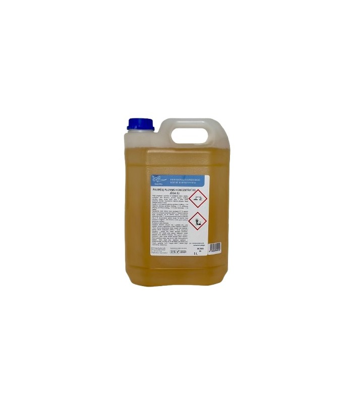 PAVIRŠIŲ PLOVIMO KONCENTRATAS JĖGA 5U 5 L PASKIRTIS: Stiprus šarminis ploviklis Tik profesionaliesiems naudotojams. Plauti įrengimus ir paviršius iš nerūdijančio plieno, plastiko, keramikos bei kitus šarminiam poveikiui atsparius paviršius mėsos, žuvies, pieno, alaus ir kitose maisto ir gėrimų pramonės įmonėse bei viešojo maitinimo įstaigose. SUDĖTIS: Didecildimetilamonio chloridas, CAS Nr. 7173-51-5, EB Nr. 230-525-2; 2,5 %. Sudėtyje yra kalio hidroksido, < 5 %, dinatrio metasilikato, < 5 %, tetrakalio pirofosfato, < 10 %, nejoninės paviršinio aktyvumo medžiagos, 5-15 %. SAVYBĖS: Gerai plauna riebalinius paviršius. NAUDOJIMAS: Prieš naudojimą perskaitykite naudojimo instrukciją ir saugos duomenų lapą. SAUGA: Pavojinga. Smarkiai nudegina odą ir pažeidžia akis. Labai toksiška vandens organizmams, sukelia ilgalaikius pakitimus. Mūvėti apsaugines pirštines / dėvėti apsauginius drabužius/naudoti akių (veido) apsaugos priemones. Saugoti, kad nepatektų į aplinką. PATEKUS ANT ODOS (arba plaukų): Nedelsiant nuvilkti / pašalinti visus užterštus drabužius. Odą nuplauti vandeniu arba po dušu. PATEKUS Į AKIS: Kelias minutes atsargiai plauti vandeniu. Išimti kontaktinius lęšius, jeigu jie yra ir jeigu lengvai galima tai padaryti. Toliau plauti akis. Nedelsiant skambinti į APSINUODIJIMŲ KONTROLĖS IR INFORMACIJOS BIURĄ arba kreiptis į gydytoją. Turinį / talpyklą šalinti į atliekas pagal nacionalinius reikalavimus. ATSARGUMO PRIEMONĖS: Laikyti pašaliniams neprieinamoje vietoje, sandariai uždarytoje originalioje gamintojo pakuotėje, vėsioje vietoje. LAIKYMAS: Tinka naudoti 12 mėn. nuo pagaminimo datos.